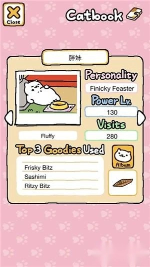 c、贪吃猫:胖妹。这只猫总是会把猫粮吃个精光,虽然已经在场景里的猫咪不会被她立刻赶走,但要是没有猫粮的话,就没办法吸引新的猫咪过来。要是你太着急,在胖妹刚吃完还在休息的时候就把猫粮添满,那她会被马上赶走。赶走正在玩耍的猫咪可不是什么好事情。