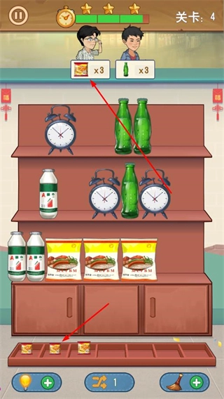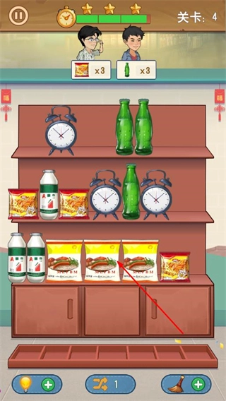 每一关都对应着顾客的商品需求,比如3包零食和3瓶饮料,需要从杂乱的货架里把对应的物品归类整理出来。这个整理过程既要留意物品的摆放位置,操作上又不复杂,这种轻策略的玩法很适配休闲的节奏。