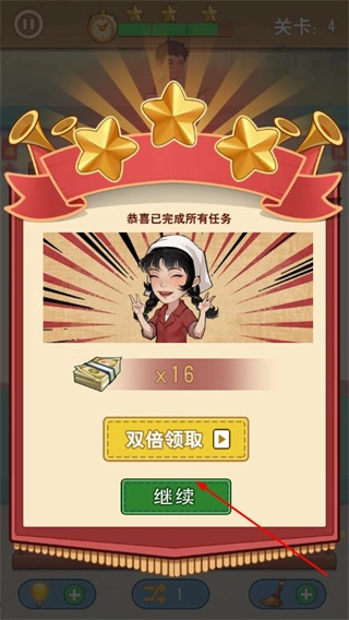 结算页面点击继续,即可进入下一个关卡继续游戏。