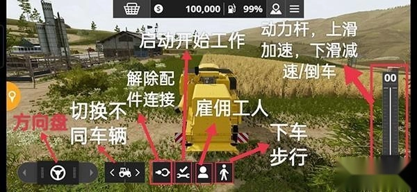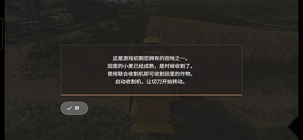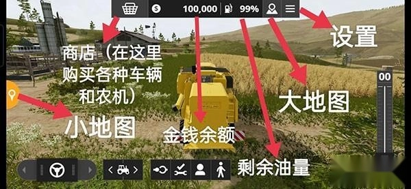 正式进入游戏后,映入眼帘的便是我们的农场。首先接触到的操作是“收割”——眼前有一片成熟的麦地,还有一台纽荷兰(new holland)收割机。具体各个图标的含义可参考下图: