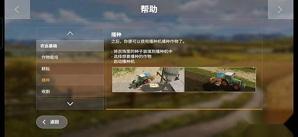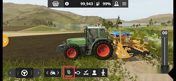 那台绿色的拖拉机是芬特515c,它后面配备了一台播种机,不过这台播种机需要玩家自行完成挂接操作。其实这个过程很简单,在游戏里玩家只需要操控拖拉机倒车,就能自动完成连接了。这一环节的设计,主要是为了让玩家熟悉农机的挂接方式以及播种机的使用方法。值得注意的是,只有部分高端播种机具备耕、播、施肥三合一的功能,而其他普通的播种机则只能在已经耕好的田地上进行播种作业。就像前面提到的那块留有作物茬的田地,初级播种机是没办法直接在上面开展工作的。