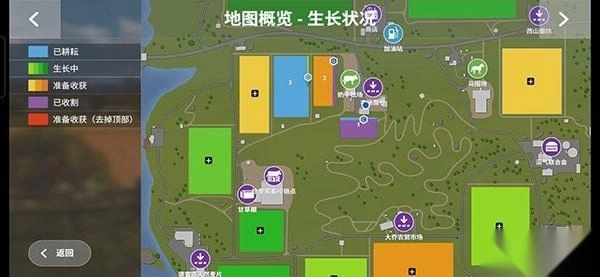 在地图上,收割完毕的农田呈现紫色;经过耕耘后,它会变为浅蓝色;完成施肥操作,农田颜色转为深蓝色;播种之后,农田呈现绿色;当颜色变为黄色时,就意味着农作物已经成熟,到了可以收割的阶段。