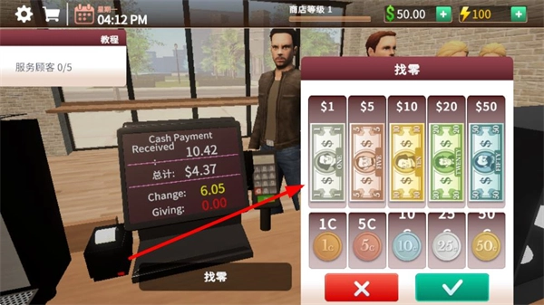 当顾客到店后,点击结账台区域,依据顾客所选购的商品,按照应找零的金额,挑选相应的纸币或硬币组合。