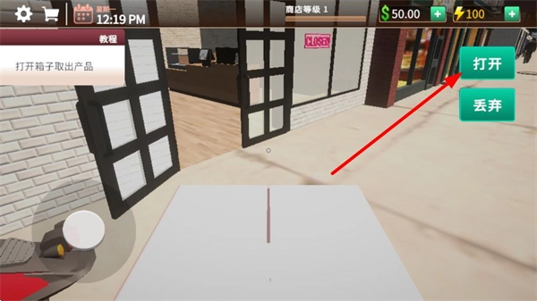 进入界面后,按照提示滑动左侧的人物控制按钮,把滑板车上的箱子取下来,再点击打开选项。