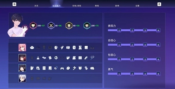 游戏中设置了表现力、包容心、自信与勇气这四项社交属性,它们会对好感事件的触发产生影响。