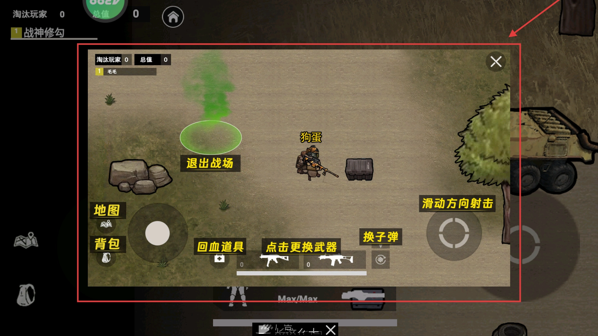 战斗前先查看教程,打开【背包】确认装备情况,记得带上【回血道具】,点击【换子弹】把弹药补充好,然后操控【狗蛋】这个角色进入战场。