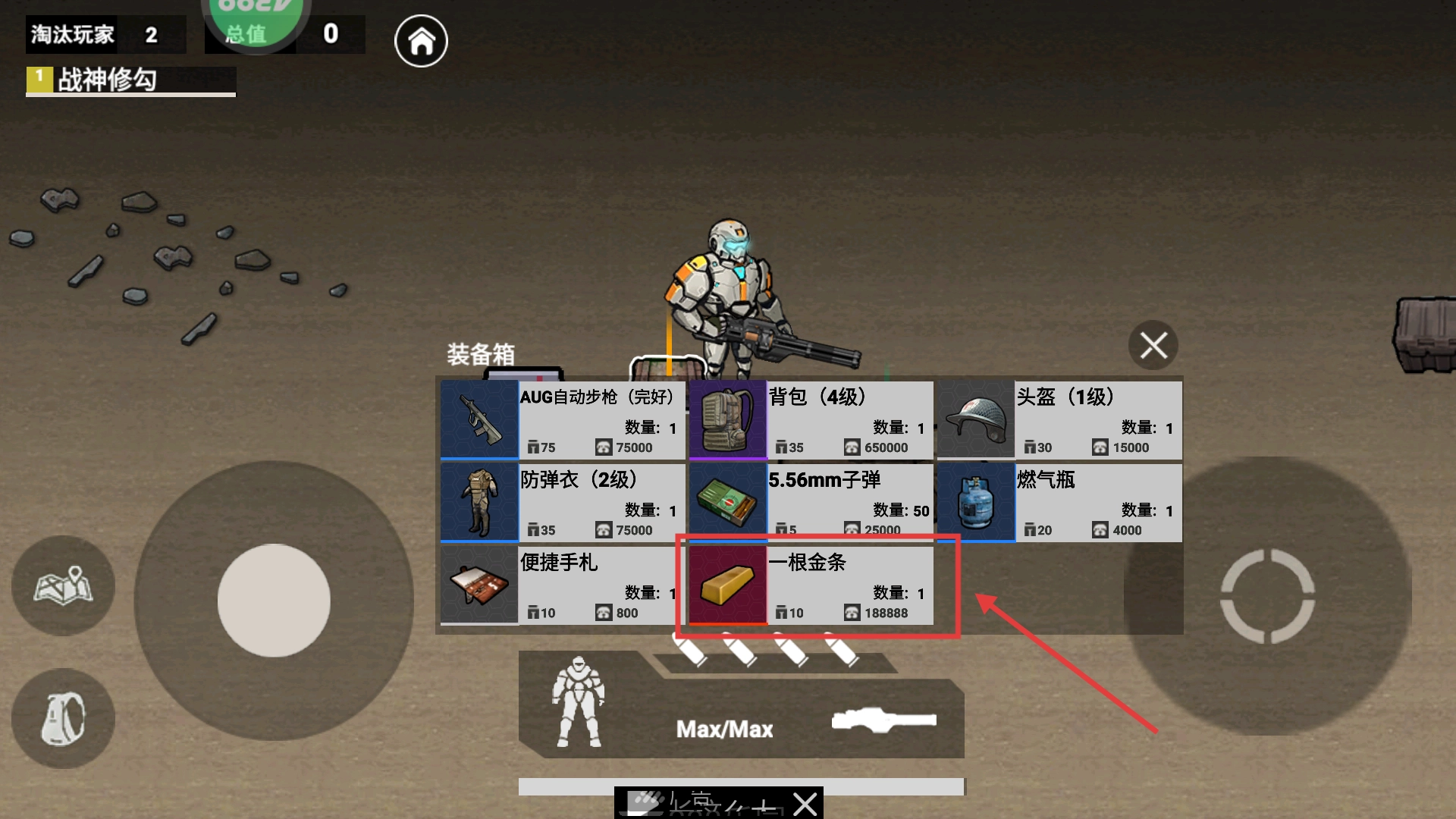 击败敌人后开启【装备箱】,优先挑选【AUG自动步枪】与【556mm子弹】,收集【金条】以兑换高级装备提升战力。
