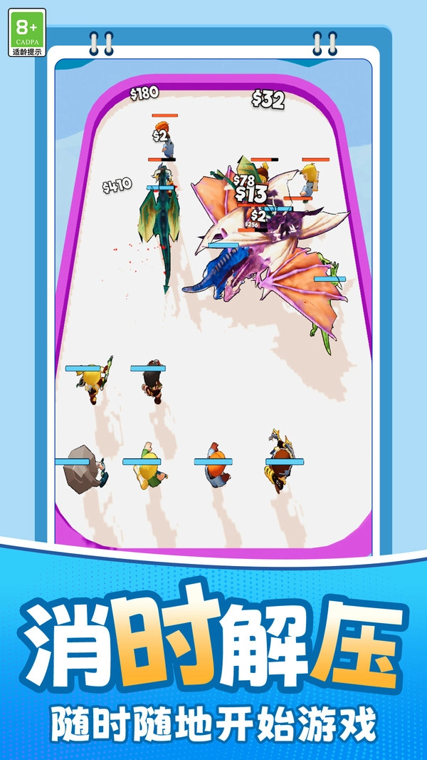 在《恐龙狩猎大战》这款游戏里,玩家将踏上充满趣味的闯关征程,收集各式各样的飞龙与射手单位,通过相同单位的合成操作,解锁更高级别的空中巨兽或是神射手角色。带上这些强大的伙伴登上竞技舞台,依靠巧妙的阵容布置与智慧策略来战胜对手,赢取丰厚的金币奖励以及稀有的皮肤道具。你还能够持续解锁全新的关卡、提升单位的能力,亲手打造属于自己的无敌飞龙军团!游戏以宏伟壮丽的恐龙世界作为背景,你将搭配多种多样的武器装备,在不同的场景之间穿梭探索。超精彩的游戏画风与沉浸式体验,全程都能带给你与众不同的乐趣!