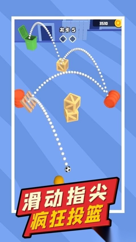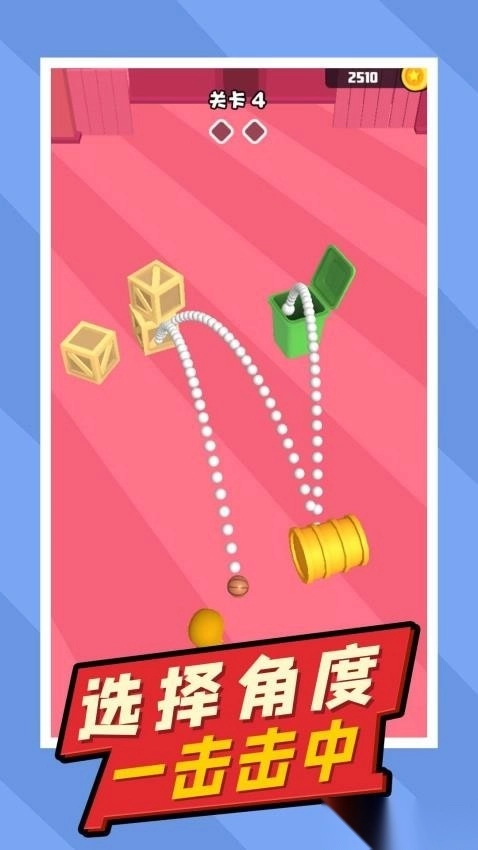 疯狂小球的玩法很简单,玩家在游戏中操控小球弹跳,只要命中垃圾桶就能获胜。游戏关卡的难度会逐步增加,您得控制小球多次弹跳才能通关。前期关卡十分简单,通常只需弹跳一次就能赢;到了后面的关卡,就需要让小球弹跳两次、三次,最终精准弹入垃圾桶才算胜利。游戏里还设置了各种弹跳道具,比如可以让小球先弹到箱子上,接着跳到油桶,再弹到其他道具上,通过这样的多次弹跳成功命中目标即可获胜。玩家需要把控好小球的弹跳力度和角度,这样才能完成多次弹跳的操作。感兴趣的朋友可以试试这款游戏。