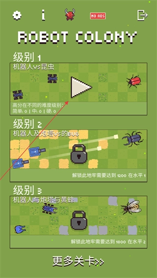 进入机器人殖民地游戏的主页后,初始状态下玩家仅能参与级别1的挑战,后续关卡需逐步解锁。