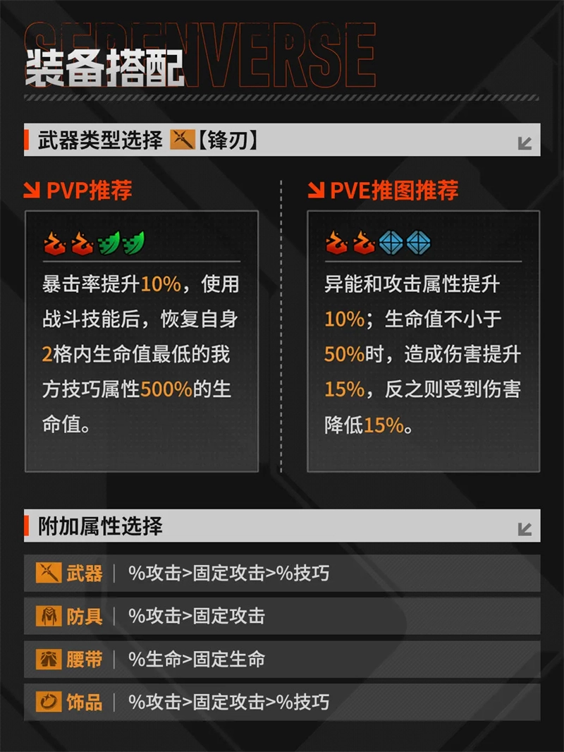 PVE推图建议搭配:异能/攻击属性提升10%;当生命值处于50%及以上时,造成的伤害增加15%;若生命值低于50%,则所受伤害减少15%。