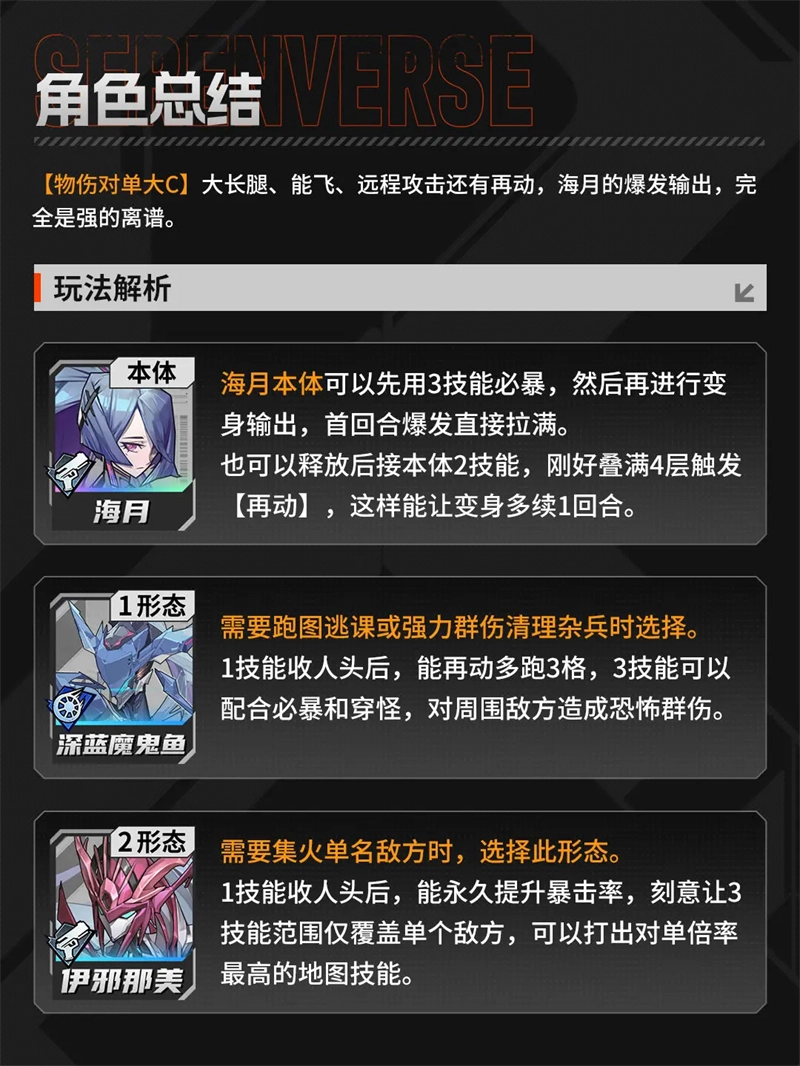 海月作为物伤领域的对单核心输出角色,不仅具备远程攻击和飞行能力,还拥有再动机制,其爆发输出堪称“离谱级别的强悍”,并且凭借双形态能够灵活适配各种不同的战斗场景。