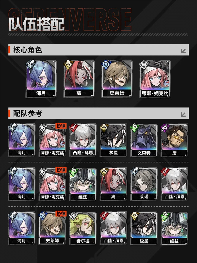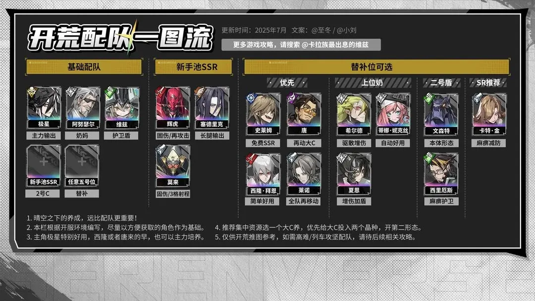 基础配队的构成如下:以“极星(主力输出担当)+ 阿努瑟尔(治疗角色)+ 维兹(护卫盾提供方)”作为核心铁三角,在此基础上搭配新手池中的SSR角色与任意五号位角色,以此确保队伍具备输出、生存、防护这三项基础功能。
