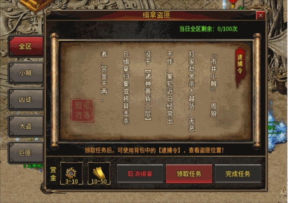 小贼每天个人可抓捕3次,全区总共能抓100次;至于凶徒、大盗和巨匪,每个人每日同样能抓捕3次。