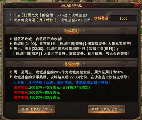 攻城时[21:00],皇宫会刷新1只【攻城巨兽[特殊]】,击败它可掉落高级装备以及大量元宝、灵符!