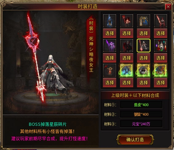玩家在游戏前期合成时装,对打怪会有不小的助力,并且时装所需的材料都是免费获取的,无论是小怪还是BOSS都会掉落这些合成材料!