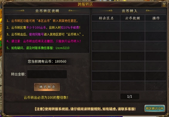 游戏里的云币可跨服转入转出,物品超长保值!