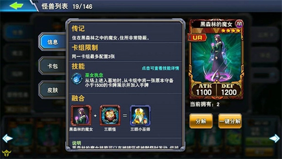 游戏后期也常会用到的卡牌里,神反绝对是榜首,堪称翻盘神器。黑魔女在黑龙卡组、黑暗大法师卡组及其他卡组中都作用显著,尤其对想玩黑暗大法师的玩家来说,她是必不可少的核心卡。番茄则是强力的预言怪兽,既能在人偶卡组里特招病毒,也能在黑龙卡组中特招黑龙之雏。另外还有个前期小技巧:决斗之城社团的社团商店里,暗黑界斗神(六星,攻1500/防2400)获取难度较低,搭配番茄特招能快速站场。