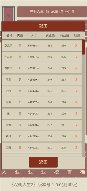 《汉朝人生2》测试版是一款以西汉历史为背景的单机文字模拟经营游戏。当玩家自立称帝后,将解锁地方治理玩法——需为各郡委派太守,太守的军事、政治等四项核心属性会直接左右治理成效。在发展过程中,玩家要制定清晰的方针策略:比如选择优先发展农业还是商业,合理调整税收政策(过高的税率容易激起民众叛乱),同时布置守军防御外敌。整体需平衡民心、经济与军事三者的关系,以此保障政权的稳定运行。