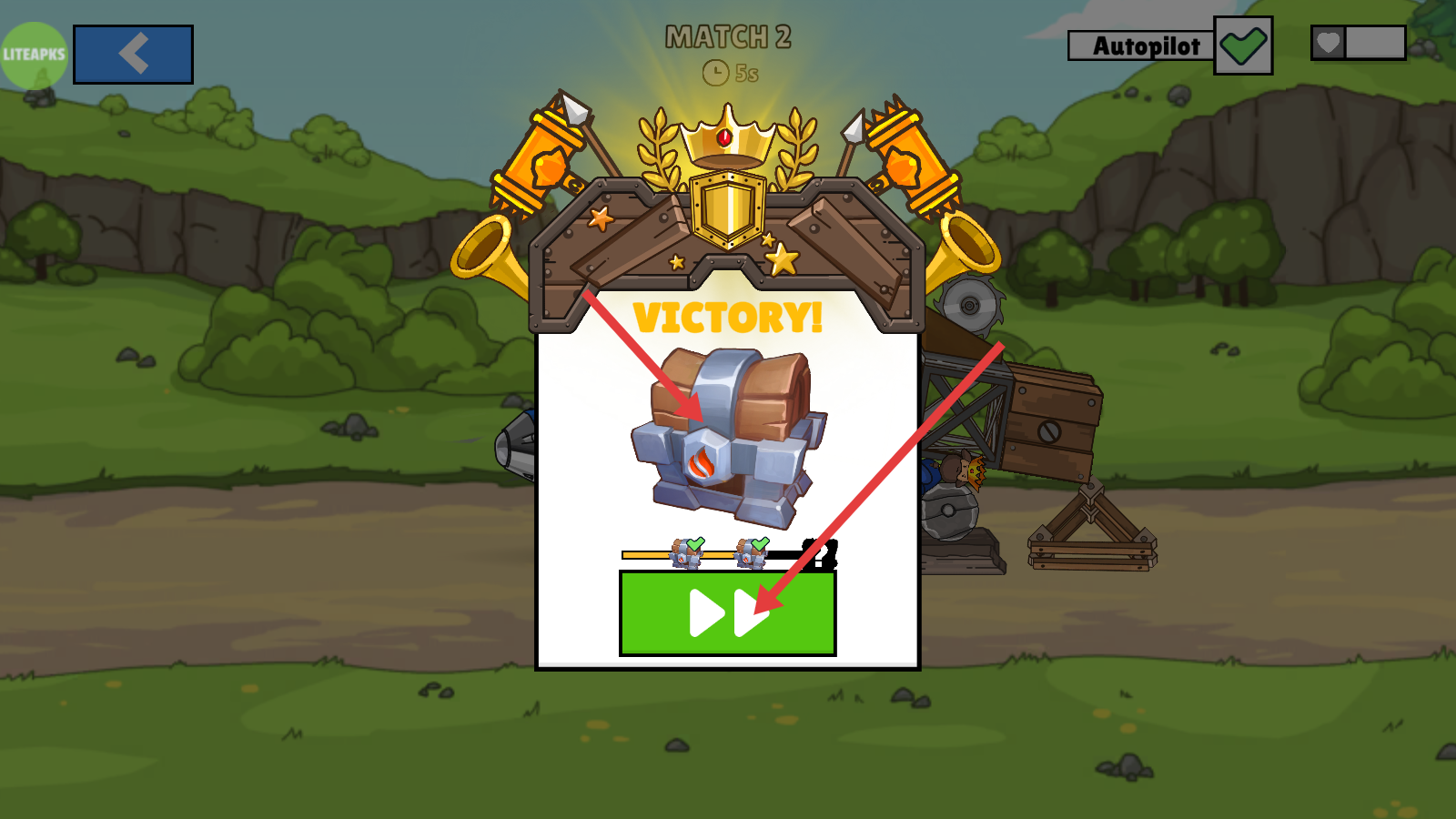 4、对战获胜后会显示【VICTORY!】的提示,点击绿色按钮继续操作,就能领取宝箱奖励,积攒资源来为后续的战车升级做准备。