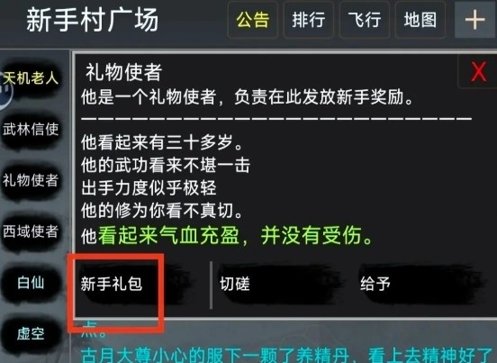 转生落地新手村后,玩家在广场左侧能看到几位NPC,他们分别是“天机老人”“武林信使”“礼物使者”和“西域使者”。