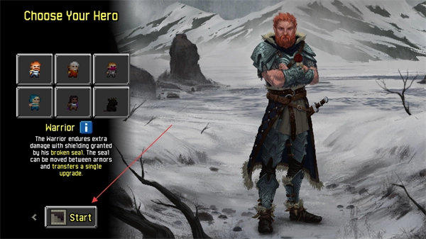 1、这里有多种职业可供挑选,就像图里的战士职业,凭借破碎之印能获得额外的伤害减免,选好职业后点击Start,就能开启地牢冒险之旅。