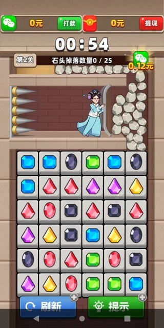 4、如下图所示,玩家要在1分钟内匹配消除画面下方的砖块,让画面上方的所有石头能顺利下落,以此成功营救主角。