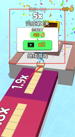 2、把方块堆叠到一定高度,之后前往终点完成结算,在这个过程里还能获取各式各样的游戏奖励。