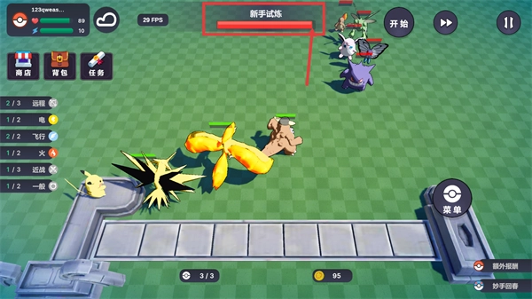 4、在【新手试炼】的进程中,我方安排具备【远程】-【电】等属性的宝可梦,凭借这些属性方面的优势来与敌方对抗,以此推动试炼进度的前进。