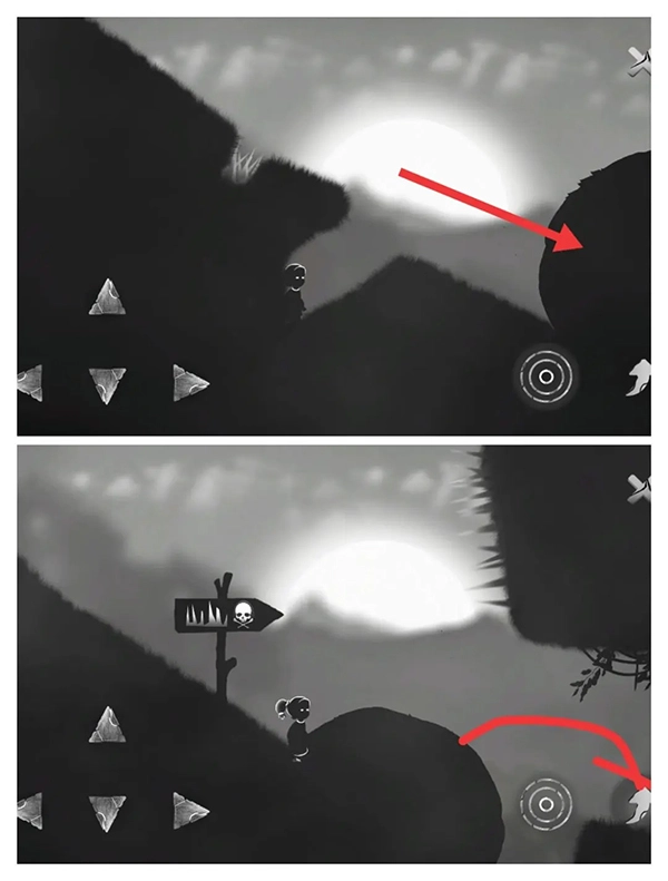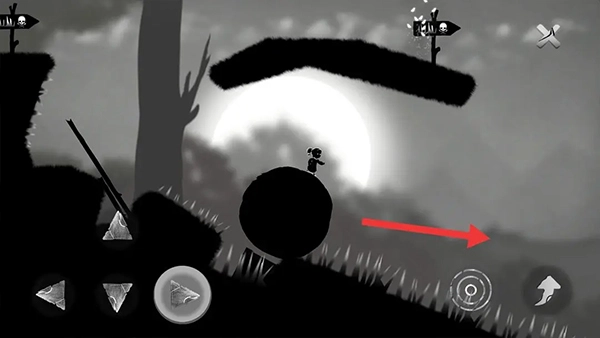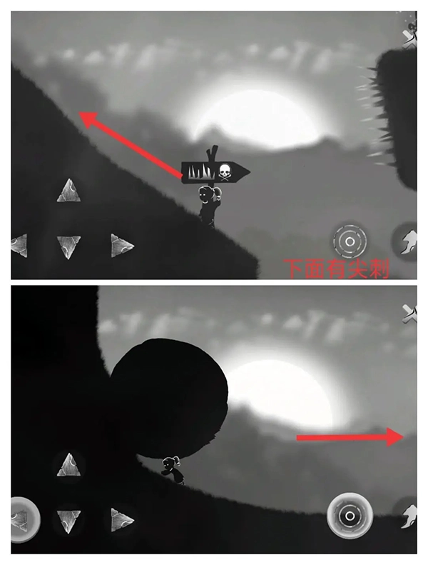 ④向右走到悬崖边时会出现死神。此时需向左奔跑,在躲避尖刺的同时,还要留意别被死神抓住。