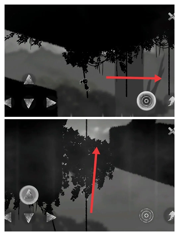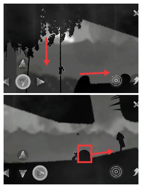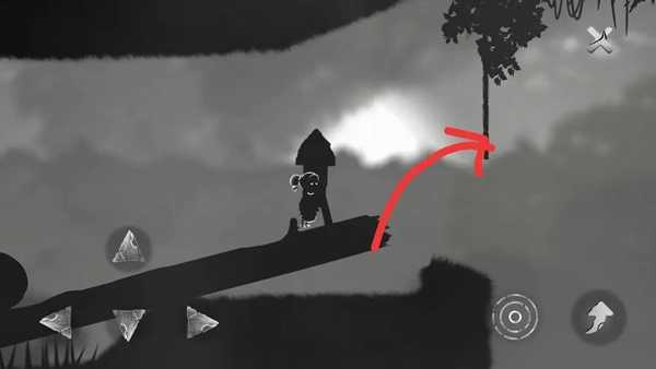 ⑤走到藤条旁触发人类返祖机制,模仿猿猴的动作荡起藤条。记得操控方向键,让女孩调整重心,这样能更靠近右侧的藤条。