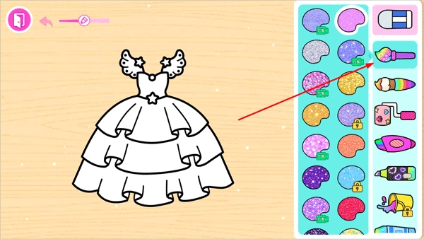 3、点击画框区域,即可开启新裙子的制作功能,右侧配备的是用于给裙子上色的画笔与颜料。