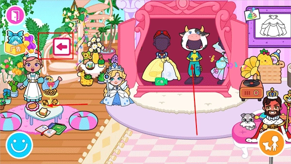 2、左右滑动屏幕可切换房间内的不同场景,还能拖动公主调整她的位置;点击衣柜中的衣服即可为公主更换装扮,左上角的箭头按钮则能切换至其他场景。