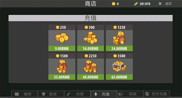 接下来要聊聊它的氪金系统了,没错,它居然设有氪金系统,不过这也能理解,毕竟开发团队规模不大,总得让人家吃饭生存嘛。但完全不必担心其他玩家会氪出强力神装,然后出现一枪秒杀的情况,更不用担心自己会因为氪金而倾家荡产。另外,充值获得的金币,在每次成功安全撤离后还会额外奖励一枚。