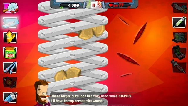 操作时,既可以全屏滑动,也能点击功能按键,借助各类工具来处理伤口——比如用菠萝刀划开伤口、订书机缝合较大的伤口、打火机烧灼让伤口闭合等。游戏过程中需要注意上方的时间限制与心跳速率,一旦心跳不足,就得注射药剂来维持生命。