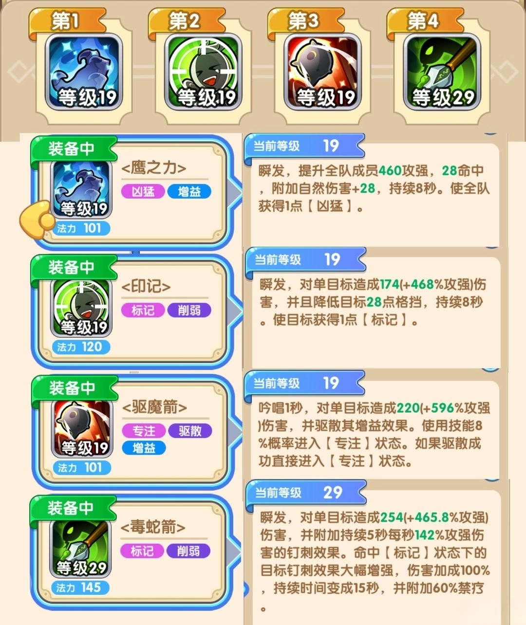 技能【鹰之力】能为全体友军大幅提升攻强与命中,还会附加自然伤害,在游戏前期实用性极高,建议优先升级;【驱魔箭】和【毒蛇箭】均具备高额单体伤害,二者的区别在于,【驱魔箭】可直接驱散敌人的增益效果,【毒蛇箭】则需要先触发印记才能附加禁疗效果,因此【印记】技能务必排在【毒蛇箭】之前。