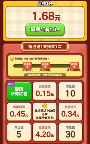 大多数情况下抽到的可能只是幸运值,得攒够一定数量的幸运值才能兑换红包奖励,这些奖励并非直接可提现的类型。这款游戏正常的提现方式应该是通过金币兑换,不过兑换比例的初始值很低,需要通过闯过大量关卡才能提升这个比例。