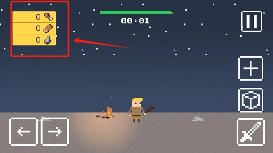 1、先进入游戏,能看到肉类、木材和石头的数量都是0。