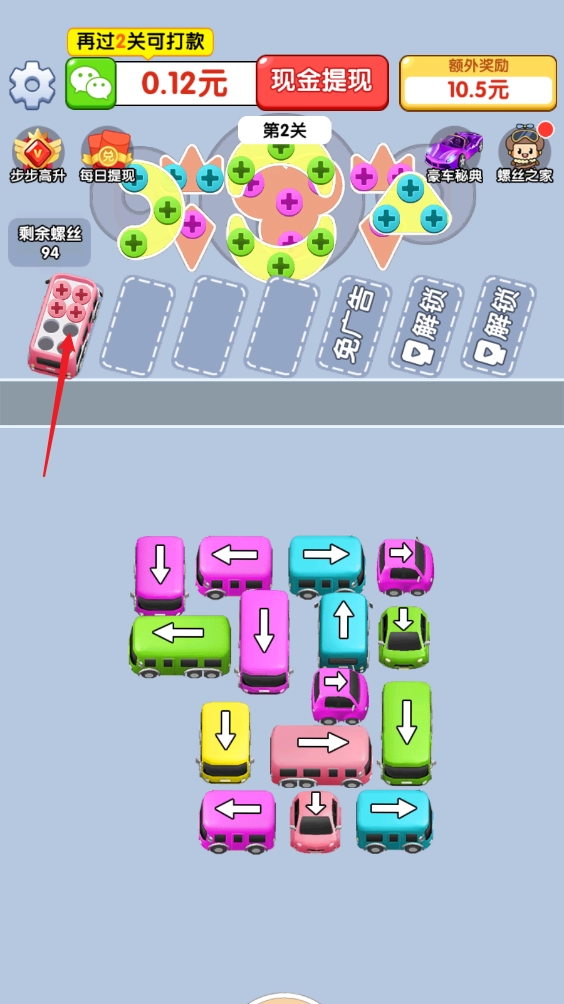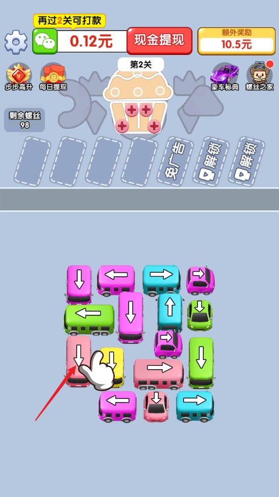1、这款游戏在玩法上融合了解螺丝与停车位两种游戏的元素,首先需要我们找出那些前路没有阻碍的车辆,然后点击该车辆即可。