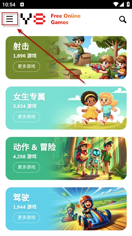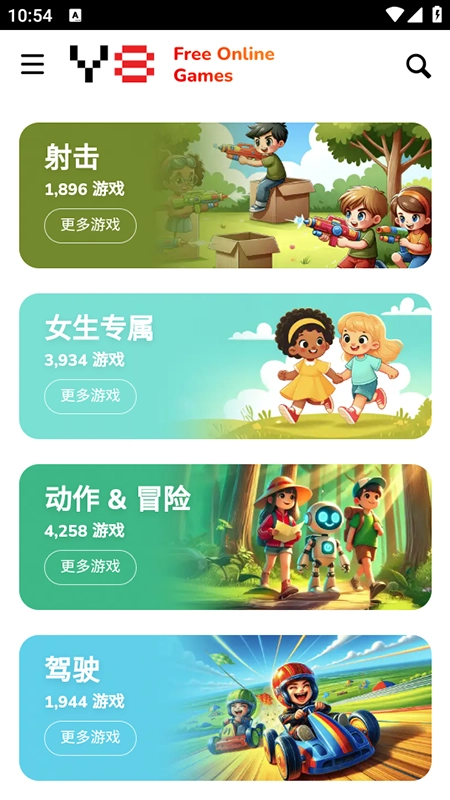 进入Y8 Games后,首页会呈现出射击、动作、冒险等各类游戏资源。