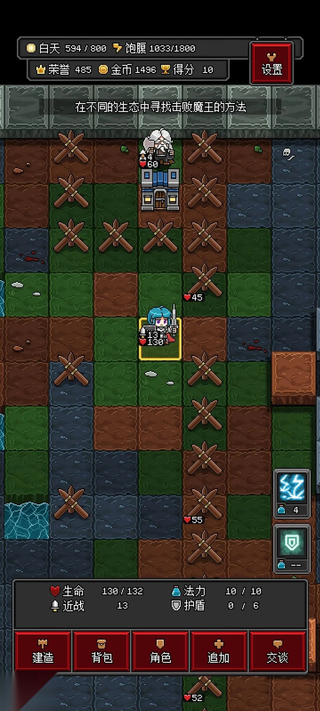 1 开局拆掉家里所有物品,直接前往右上角,建造一座小屋来雇佣工匠,再搭建一座塔和尖刺以保护他。