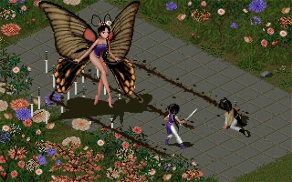 10、出扬州遇到剑圣的场景里,DOS版的背景是蓝天;98版则是黑色背景(神木林的情况也相同,DOS版是蓝天,98版是黑屏)
