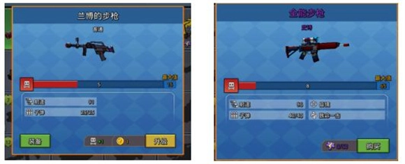4、此区域用于展示玩家当前身上所预览的武器装备效果。装备属性信息方面,该区域会呈现玩家当前选中装备的详细信息,例如武器的伤害效果等。购买/升级按钮的功能为:当选中未购买的武器时,按钮显示为“购买”;若选中已购买的武器,按钮则显示为“升级”。点击“升级”或“购买”按钮,系统将自动打开武器升级/购买界面;点击界面任意空白位置,即可关闭该界面。
