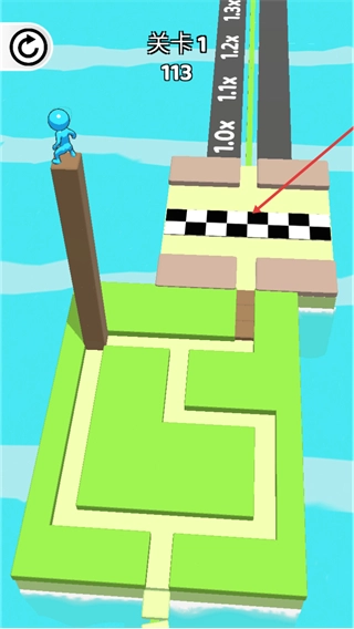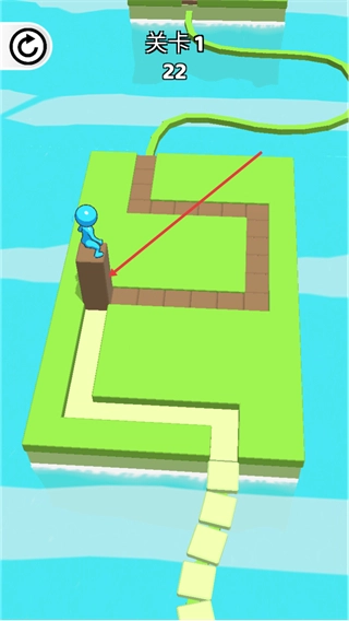 2、当处于关卡1的进度阶段时,操控角色沿着当前的曲折路径移动,收集所有木板以用于铺设后续的道路,从而提升关卡的进度数值。