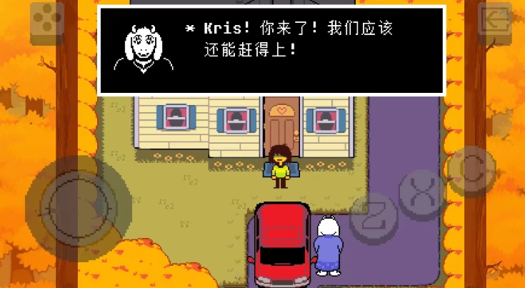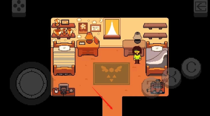 4、接着便正式进入游戏环节,托丽尔呼唤着克里斯(Kris)的名字,提醒他上学别迟到,(按下“乙”键推进流程),玩家要操控Kris起床并出门前往学校;滑动左侧的控件,引导Kris走到箭头所指的位置,随后场景就会切换到下一个画面。