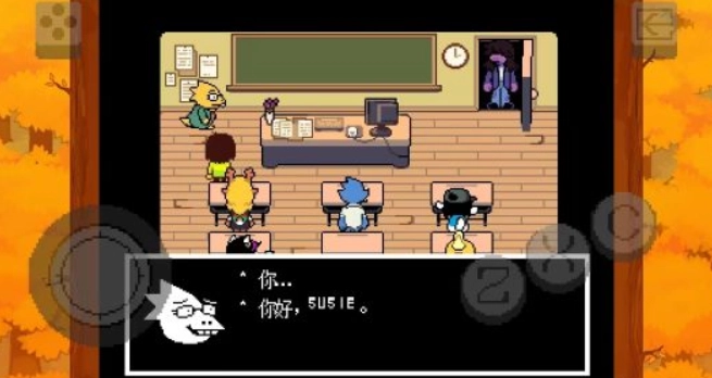 6、当克里斯抵达学校时,老师艾菲斯(Alphys)早已布置好了小组作业,要求学生两人一组完成任务。而等克里斯到的时候,其他同学都已经找好搭档了。此时,玩家需要前往第一排最左边的同学处,按下“乙”键与其对话;随后又有一个人出现了。