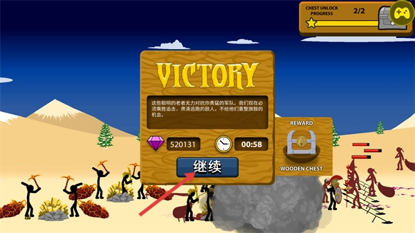 3、取得胜利后会出现【VICTORY】提示,点击【继续】按钮,就能得到【520131】钻石和【WOODENCHEST】的奖励。