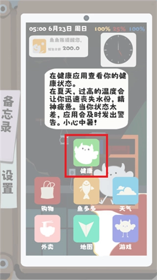 1、进入游戏后,你可以先打开自己的备忘录,点击健康类应用程序来查看身体状况,确认在炎热天气下是否出现缺水状态。