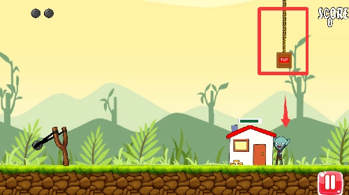 3、对准上方的绳子,将炸弹投掷到地面,炸死僵尸即可通关。