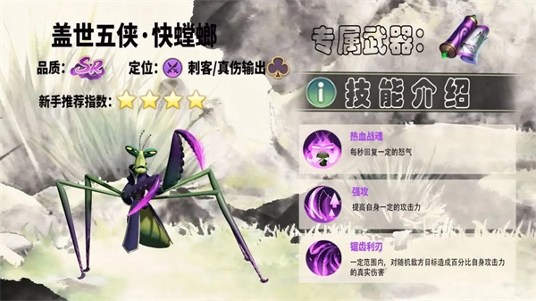 2、角色作用:盖世五侠·快螳螂是新手前期非常值得推荐的首选C位,在PVE模式里伤害输出十分亮眼,搭配“3激励2铁壁”的羁绊效果,能让队伍在坦度和输出方面都有不错的表现,而且开局时怒气积攒速度快,前期推图过程会很顺畅。这套阵容里的角色,新手在前期阶段就能比较容易地获取到;不过需要注意的是,快螳螂虽然爆发能力极强,但自身的生存能力相对薄弱,需要依靠团队的保护才能更好发挥。它还具备真实伤害的机制,实际的强度要远远超过当前的品质定位,不管是前中期的PVP对战,还是推进副本进度,它都是能发挥关键作用的角色。在前期的关卡中,快螳螂可以说是当之无愧的“后排杀手”,能够对那些高威胁的目标形成有效的克制。